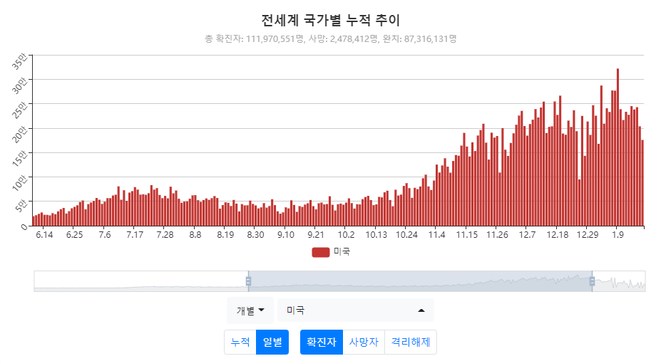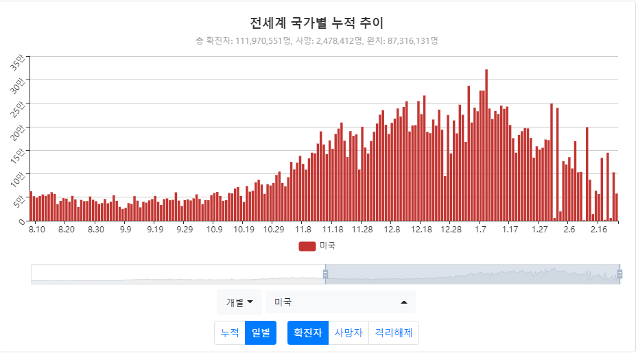 전 세계에서 압도적으로 많은 확진자를 기록한 미국의 확진자 그래프를 볼 때,