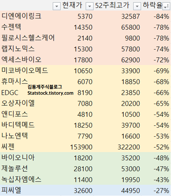 2월 22일 종가 기준 52주 최고가 대비 하락율을 나타낸 그림이다.