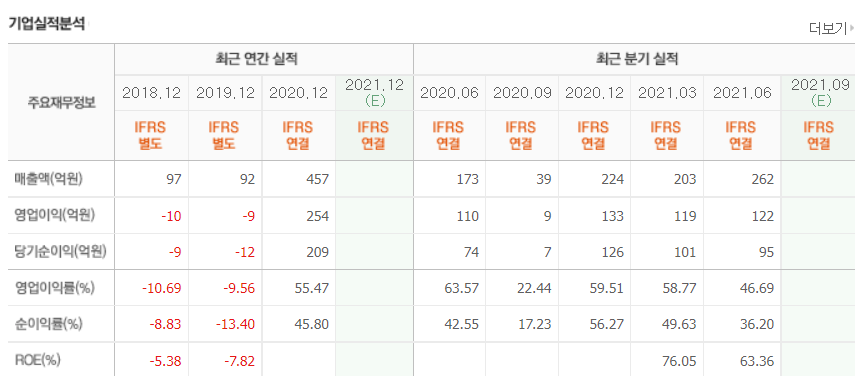 2021년 반기 (1~6월) 매출은 465억, 단가 3천원 가정시 1550만개.