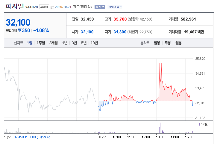 10/21 피씨엘 종가 32100원.